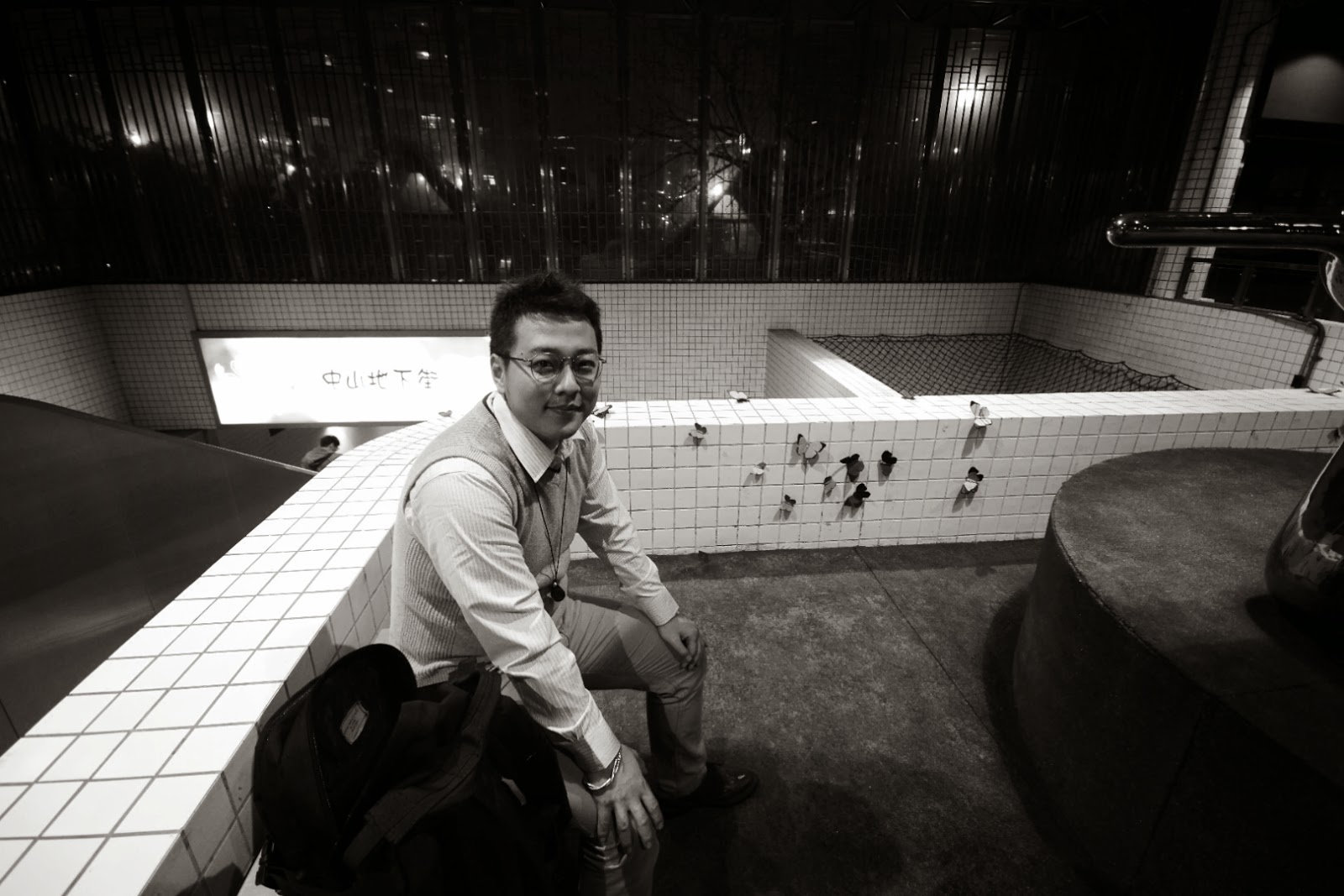 摘下眼鏡的他,放下大背包,輕微地褪去一些外衣,
